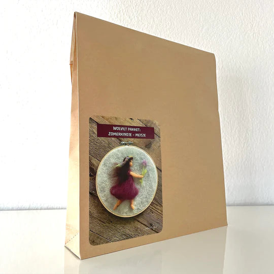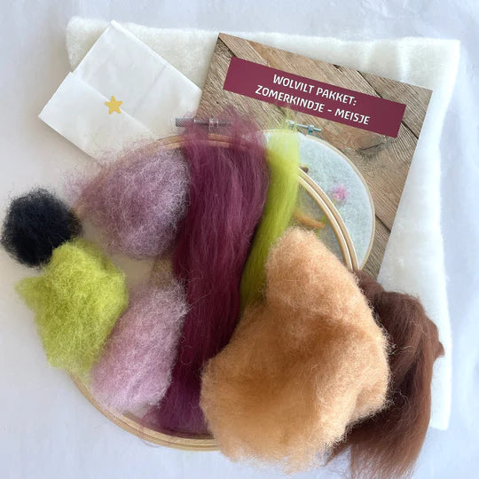 In deze set vind je wol, naaldvlies, een viltnaald, een prikmat en borduurring om je eigen zomerkindje te maken. De huids- en haarkleur kun je kiezen. Je wordt stap voor stap op weg geholpen met foto’s en een uitgebreide (Nederlandse) uitleg in een mooi boekje dat je kunt bewaren.