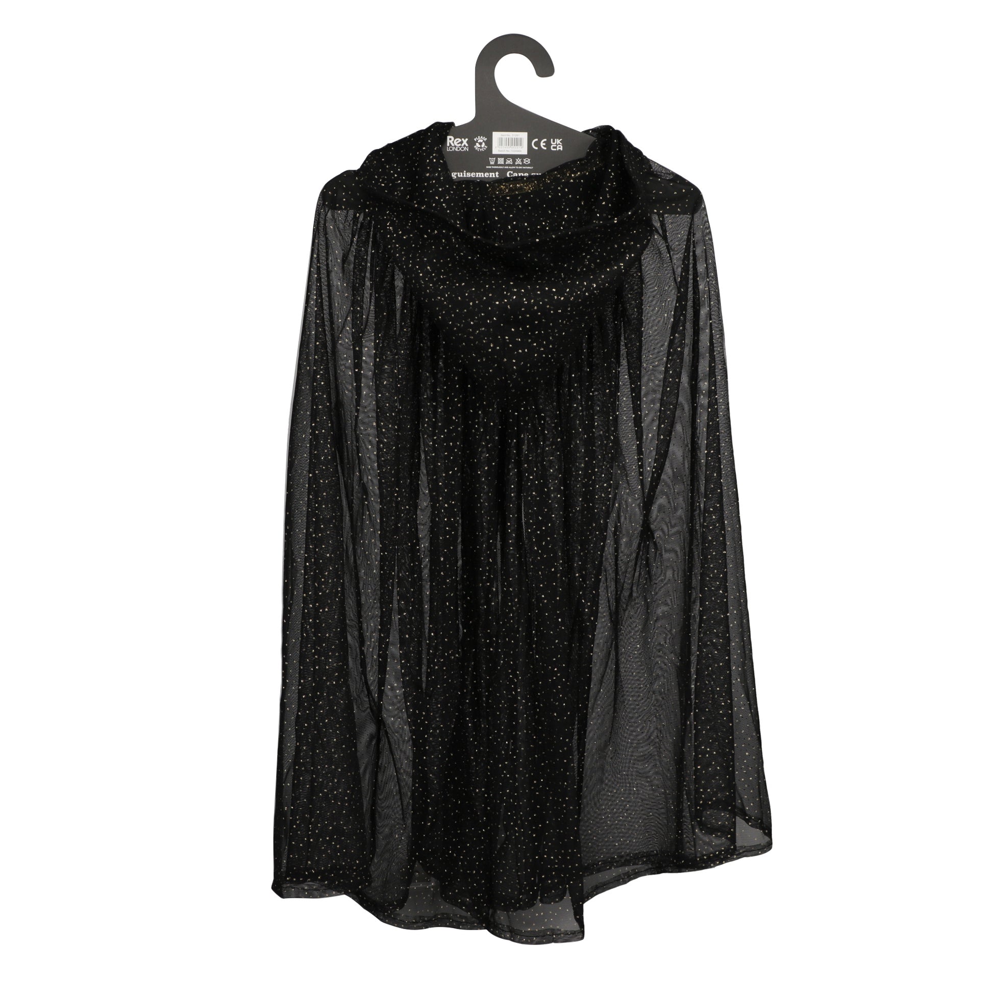 Trek deze zwarte glitter cape aan en poef! je bent klaar voor een magisch avontuur. Gemaakt van doorschijnende mesh tule en versierd met glitters, is dit de perfecte finishing touch voor elke fee, tovenaar of prins(es) in spe.