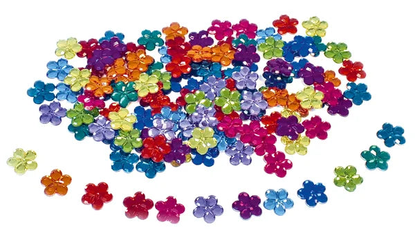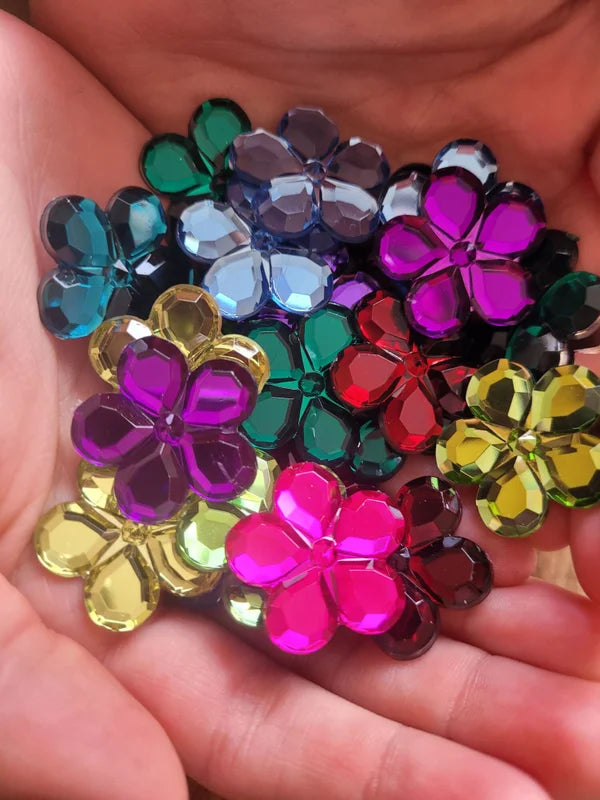 Bloemvormige glitterstenen in een set van 120 stuks met 12 verschillende kleuren.
