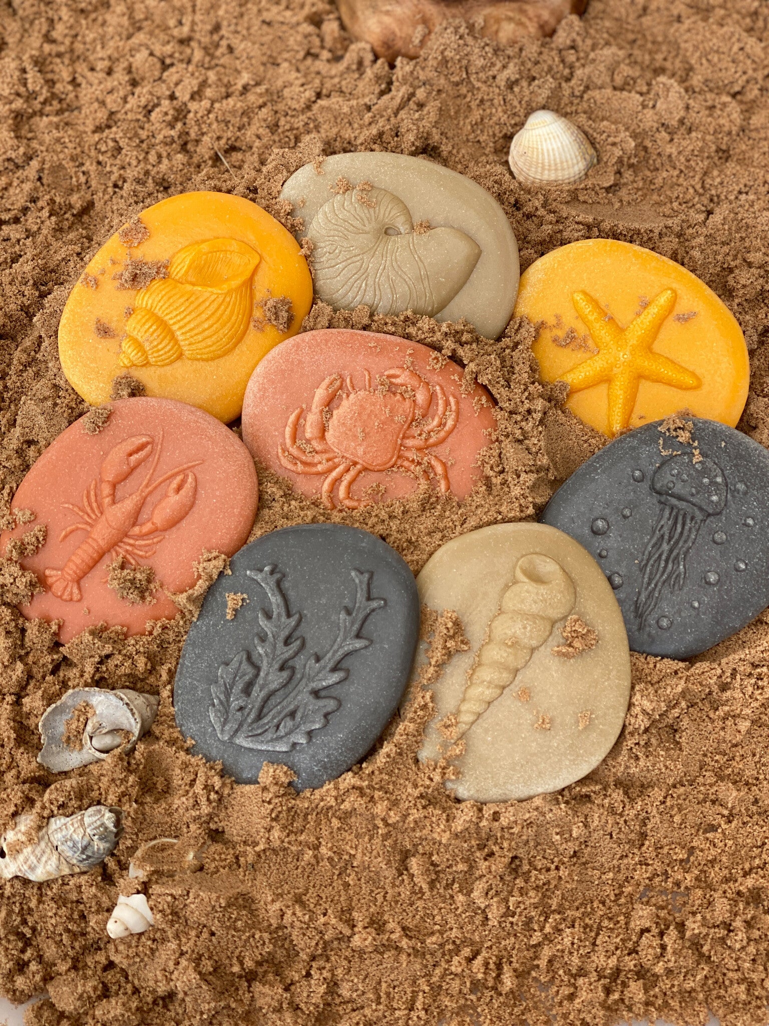 Set bevat acht stenen: boorschelp, krab, kwal, kreeft, nautilusschelp, zeewier, zeester en wulkschelp.