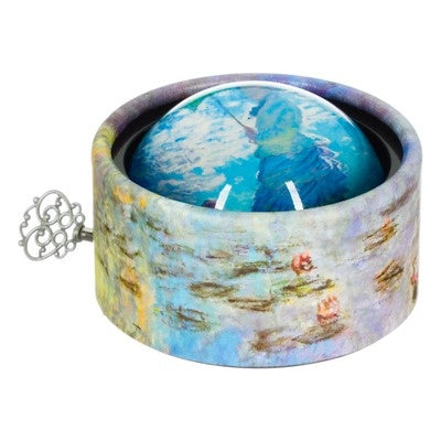 Deze verfijnde muziekdoos brengt je in één draai naar de wereld van Claude Monet. Dobberende waterlelies en de vrouw met parasol al draaiend in de glazenbol, geïnspireerd op zijn beroemde schilderijen. Zet het mechaniek in beweging, en laat je meevoeren door de rustgevende klanken van Gymnopédie van Erik Satie – minimalistisch, dromerig en wondermooi.
