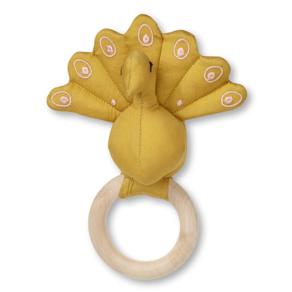 Een handgemaakte rammelaar in de vorm van een pauw.