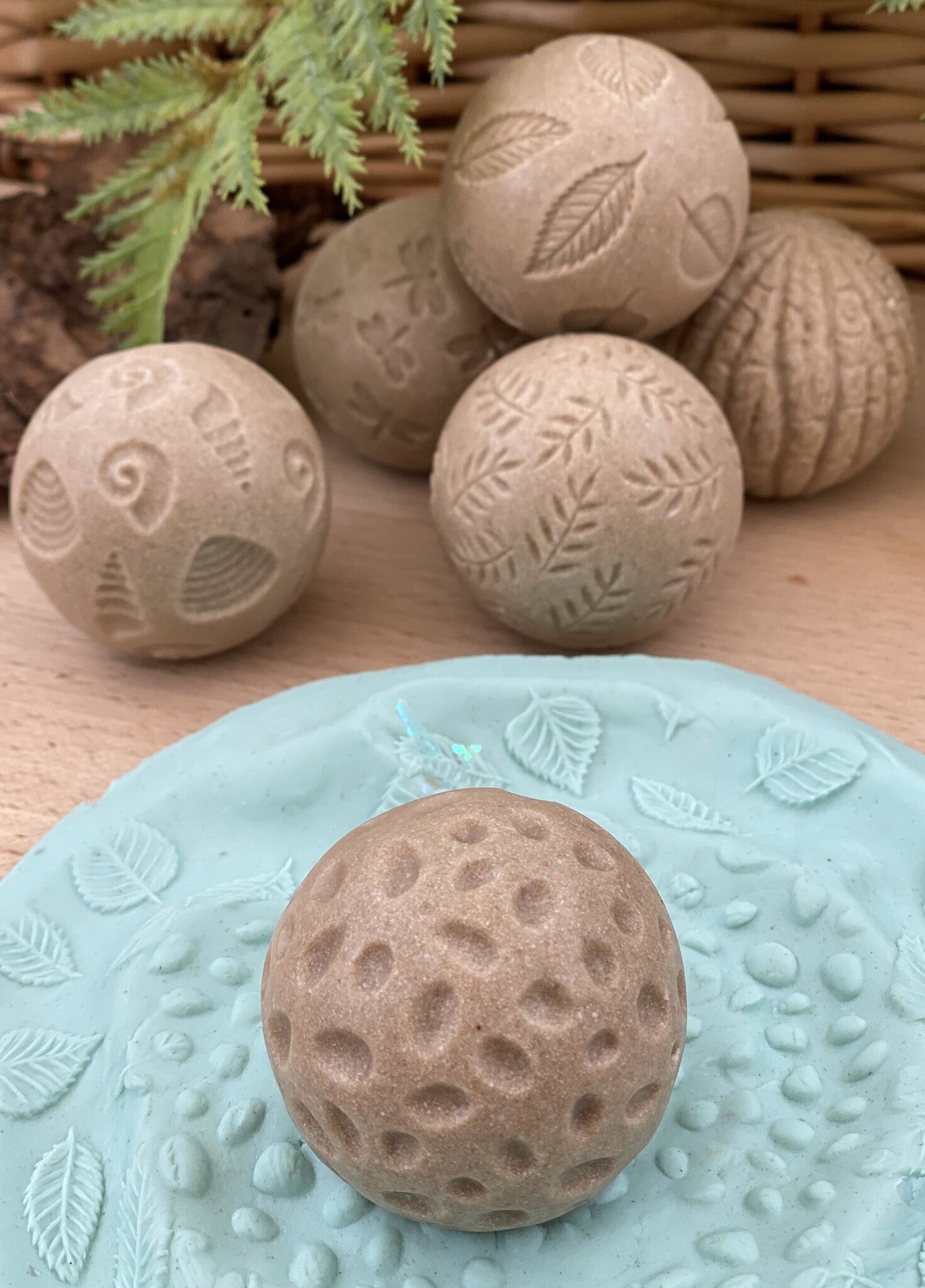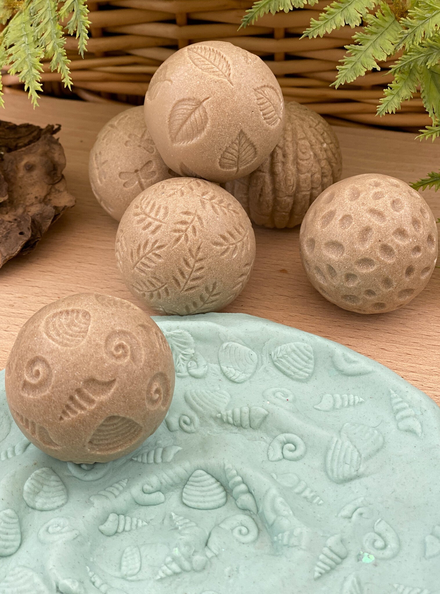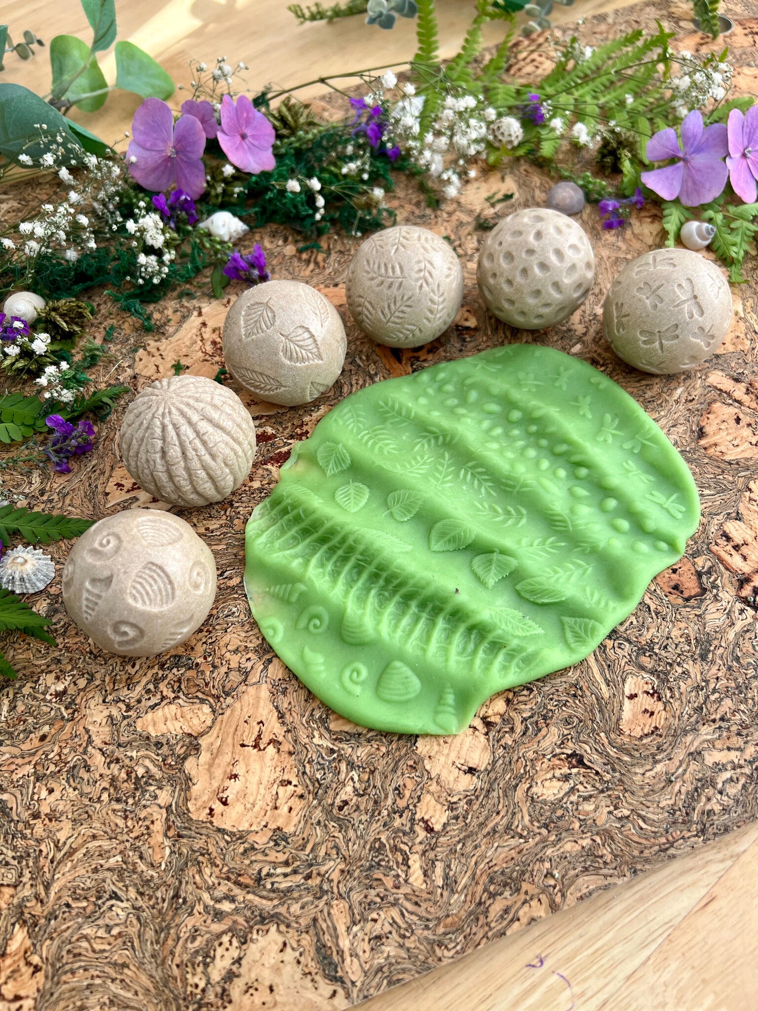 De set bevat bladeren, schelpen, varens, kiezelstenen, schors en libellen.