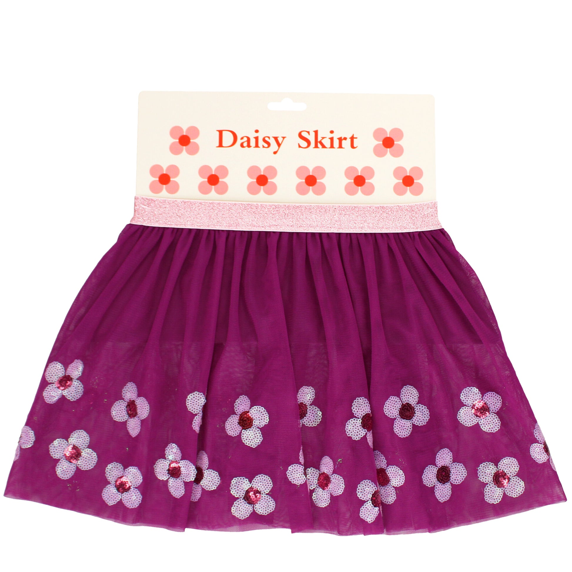 Laat fantasie bloeien met deze paarse tule rok vol madeliefjes, pailletten en een fonkelende roze tailleband met zilveren glitters. Perfect voor kleine dromers die het liefst de hele dag dansen, draaien en avonturen beleven.