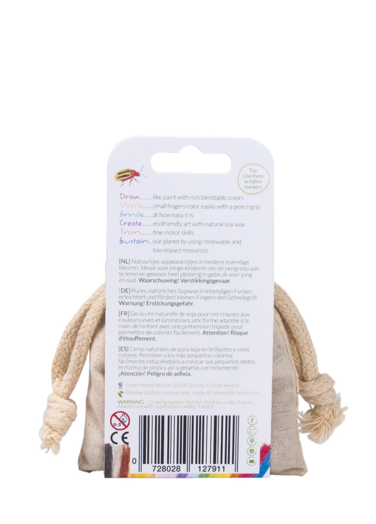 Deze natuurlijke sojawas krijtjes zijn gemaakt in de VS van lokaal geteelde sojabonen en gekleurd met natuurlijke mineralen pigmenten. Ze zijn ontworpen om de pengreep bij jonge kinderen te versterken, zodat de vingers en handen worden voorbereid op het leren schrijven.De vorm maakt het mogelijk om met kleine vingers in lijnen en grote vlakken in te kleuren. Kinderen hebben weinig kracht nodig voor deze krijtjes en daarom zijn ze fijn om door jonge kinderen te laten gebruiken. De meeste volwassenen zijn verwonderd over het gemak waarmee de krijtjes hun mooie kleur afgeven.
