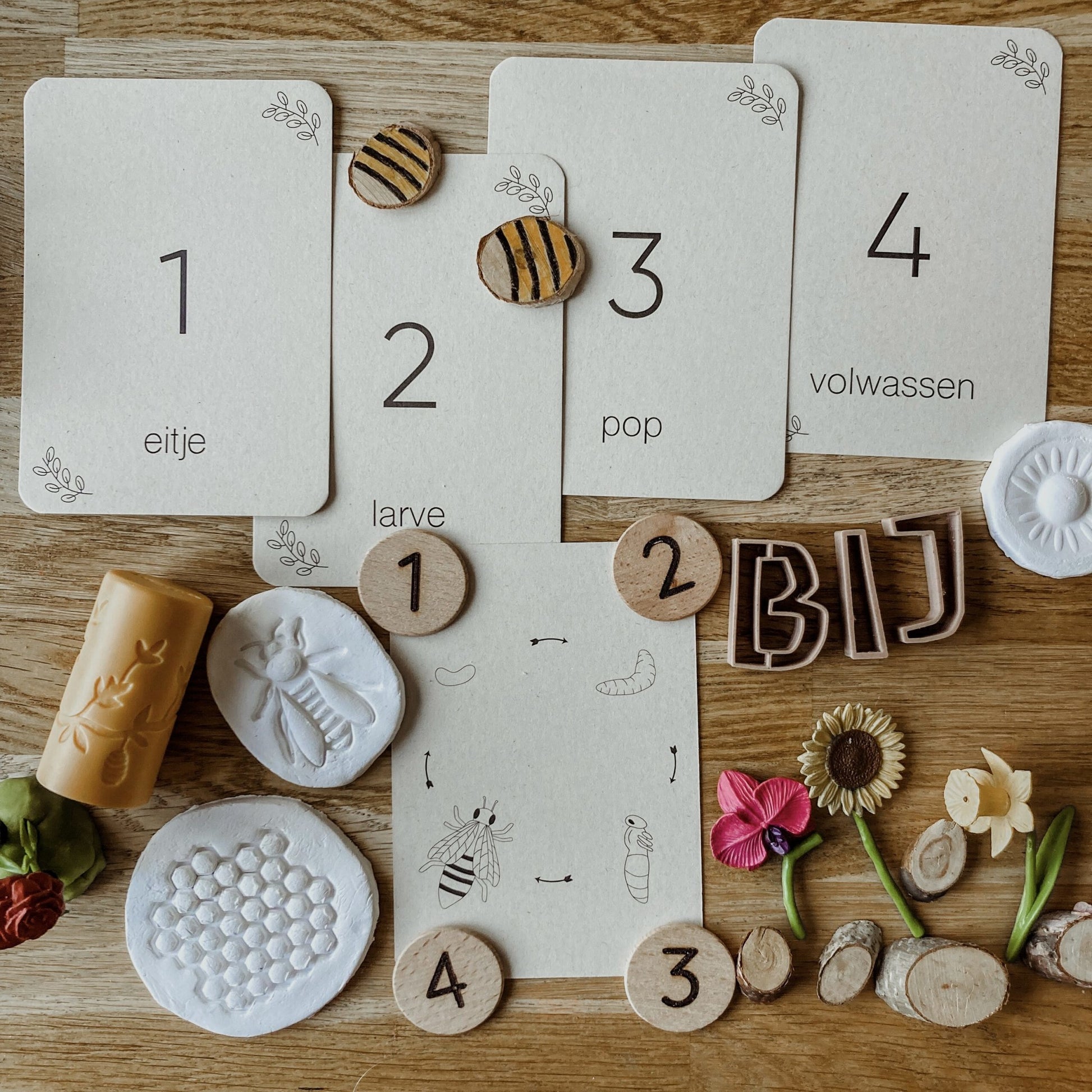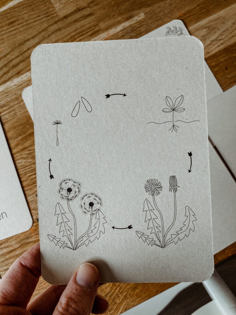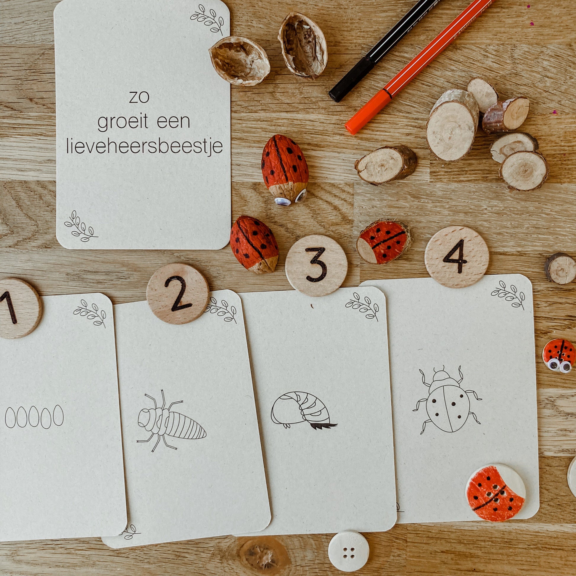 De set lifecycle flashcards bestaat uit 20 dubbelzijdig bedrukte kaarten op A6 formaat. Er zitten 4 lifecycles in de set waarvoor ik met de hand de tekeningen maakte: lieveheersbeestje, bij, paardenbloem, zonnebloem. Elke levenscyclus is afgebeeld als geheel en tevens op vier losse kaarten, zodat je kind de kaarten op volgorde kan leggen om spelenderwijs kennis te maken met de groei van de natuur.