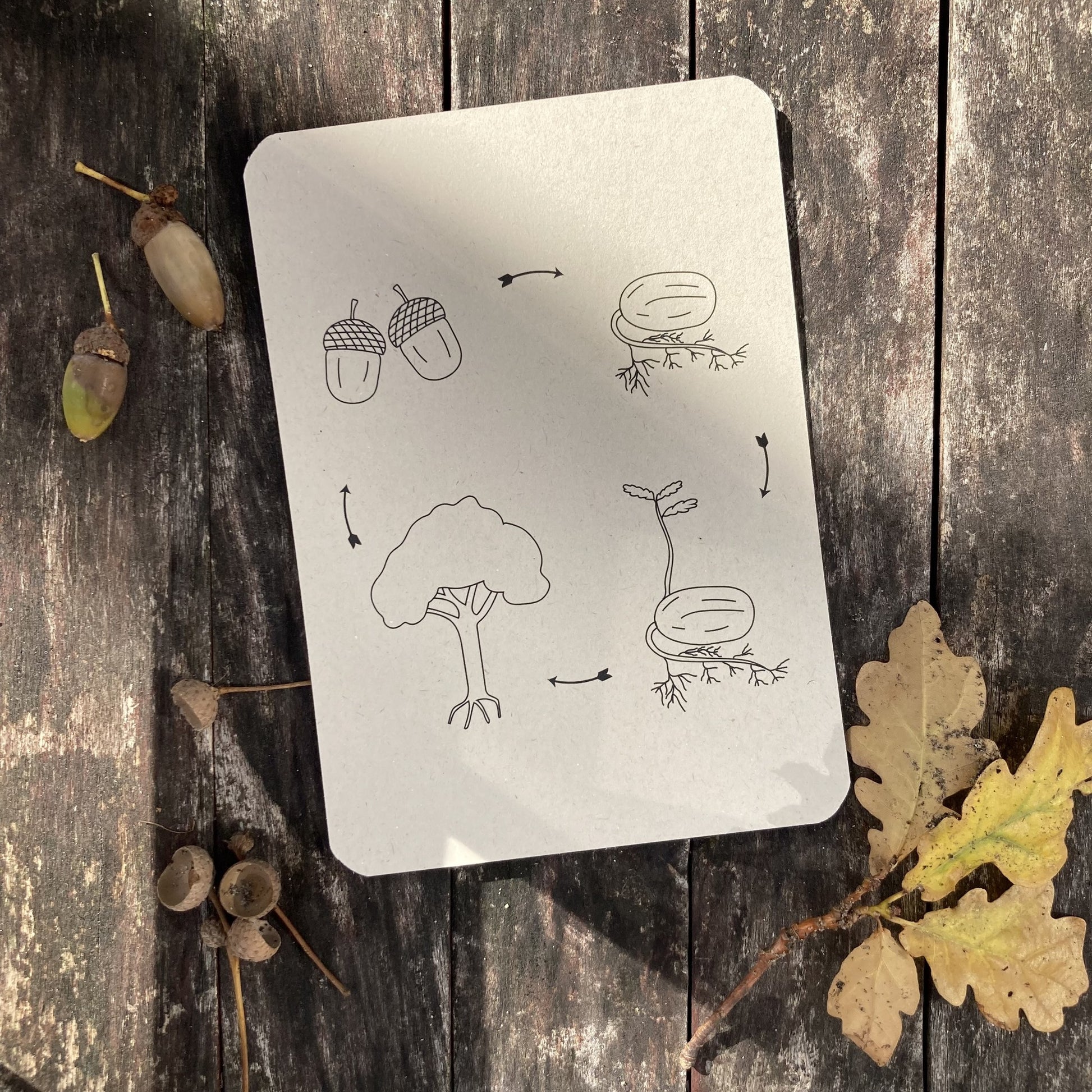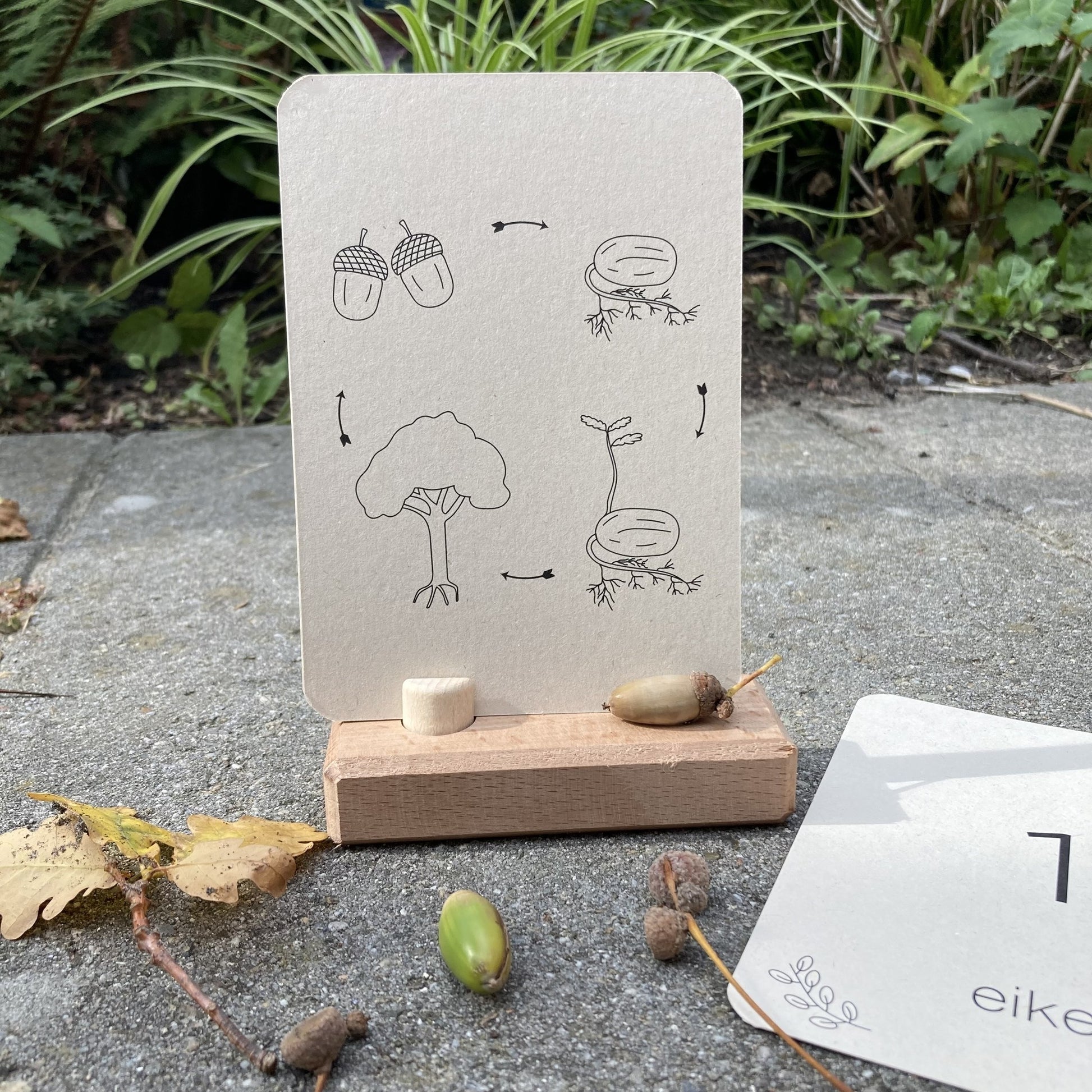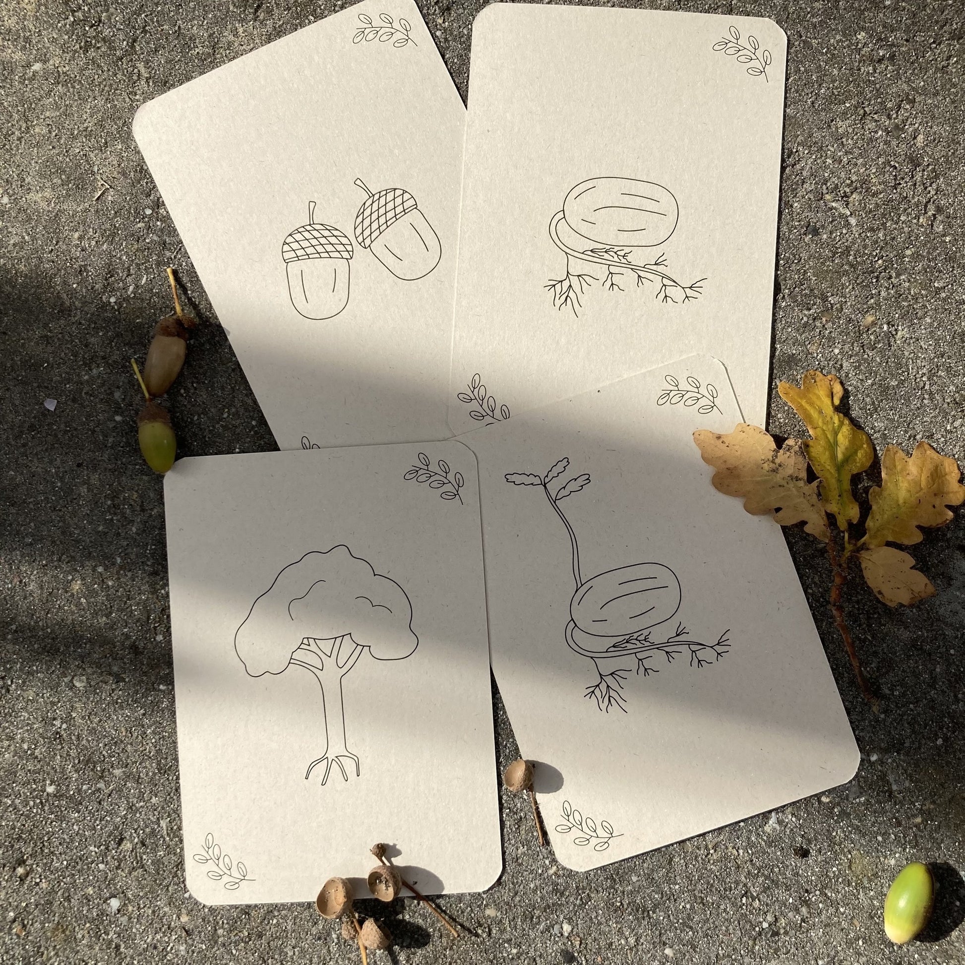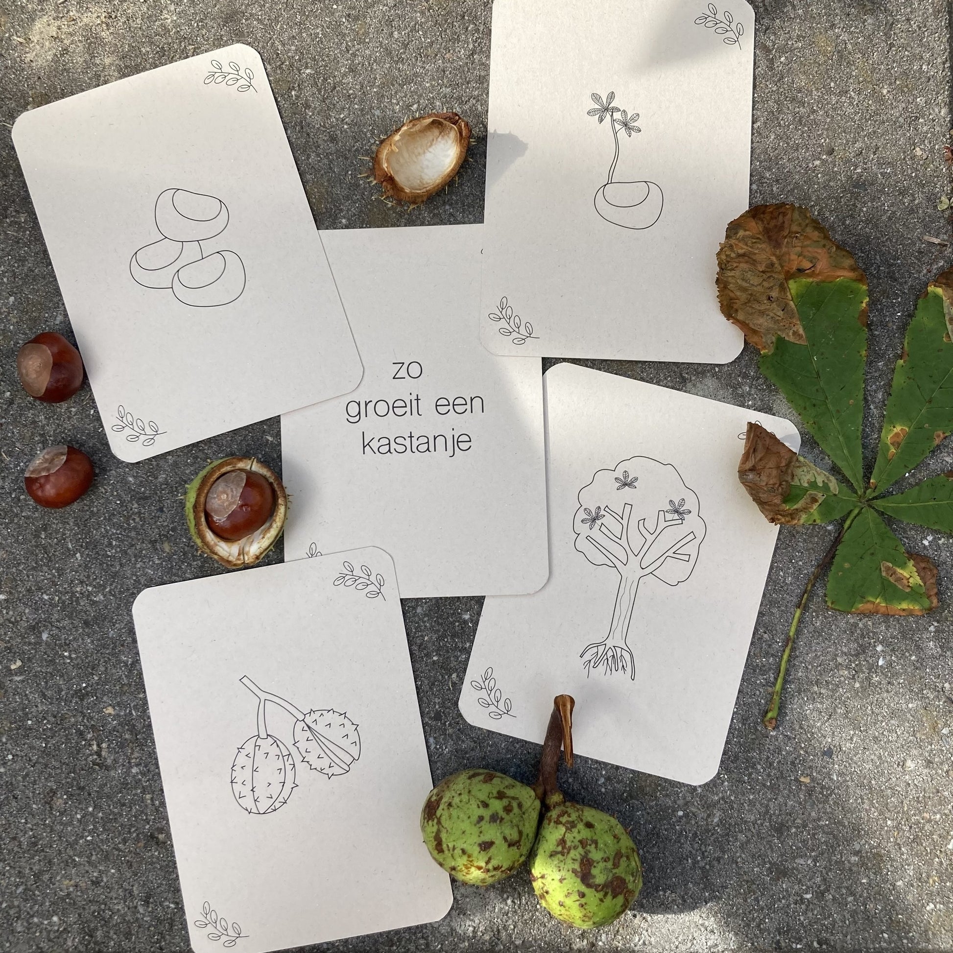 De set lifecycle flashcards bestaat uit 20 dubbelzijdig bedrukte kaarten op A6 formaat. Er zitten 4 lifecycles in de set waarvoor ik met de hand de tekeningen maakte: pompoen, kastanje, eikel, paddenstoel. Elke levenscyclus is afgebeeld als geheel en tevens op vier losse kaarten, zodat je kind de kaarten op volgorde kan leggen om spelenderwijs kennis te maken met de groei van de natuur.