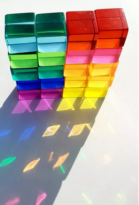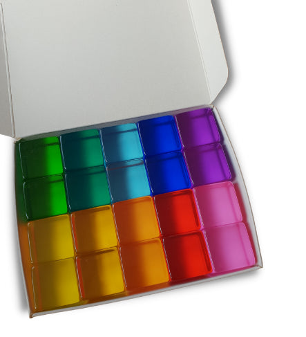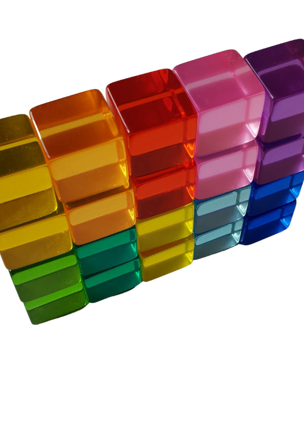 20 prachtige doorschijnende kubussen in 10 verschillende kleuren.