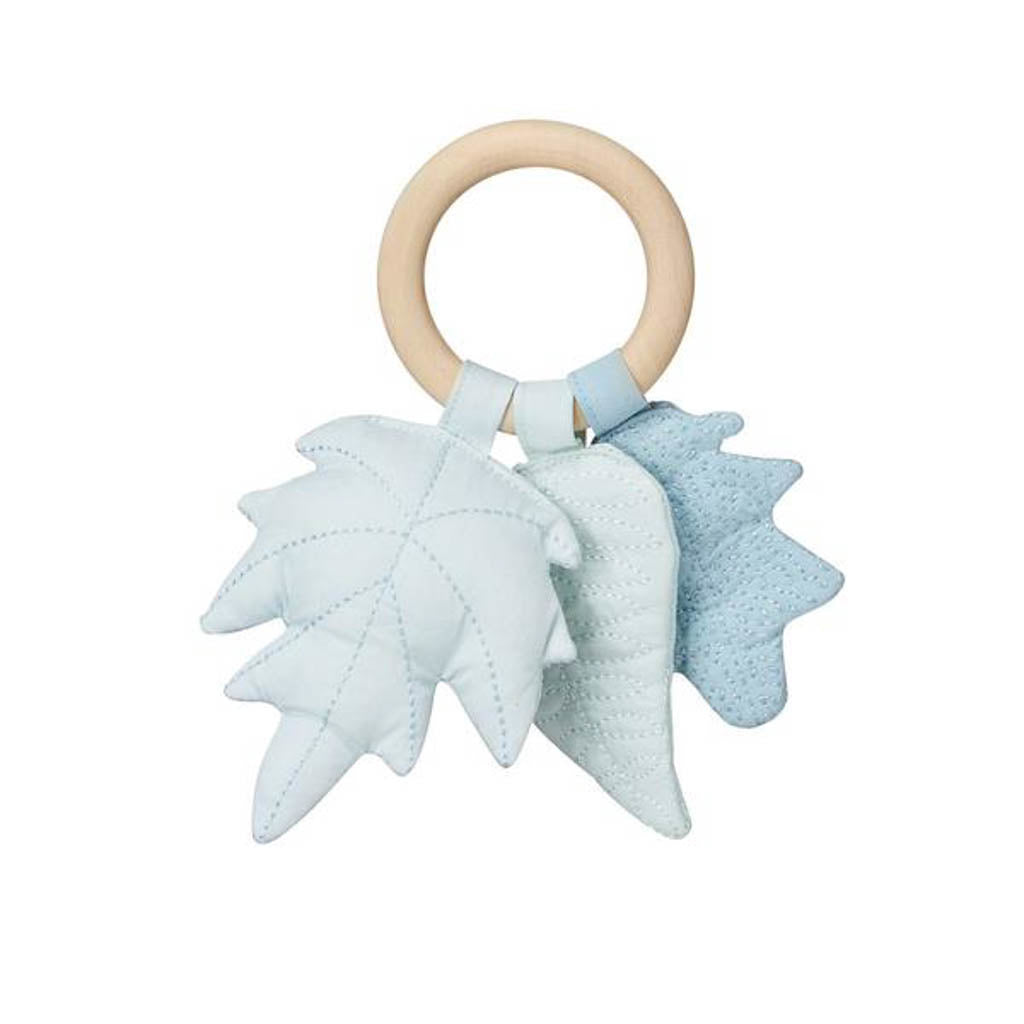 Een handgemaakte rammelaar met drie katoenen bladeren. Twee bladeren, die zijn voorzien van een knisper en het derde blad met een rammelaar.