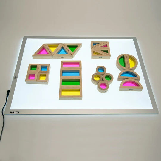TickiT® Regenboogblokken hebben verschillende vormen van rubberhout met een kleurrijk transparant acrylvenster. De transparantie van het acryl laat licht door en creëert een visueel verbluffend effect dat de verbeelding van uw kind prikkelt. Ideaal om te leren over vormen, het mengen van kleuren of het eenvoudig bouwen van blokken en ze kunnen prachtig worden gebruikt op een lichtpaneel.